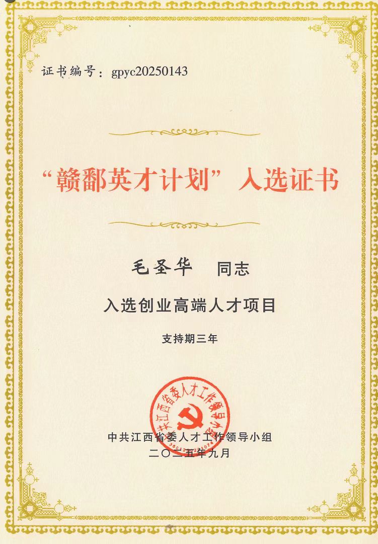 董事长毛圣华获颁“赣鄱英才计划”入选证书